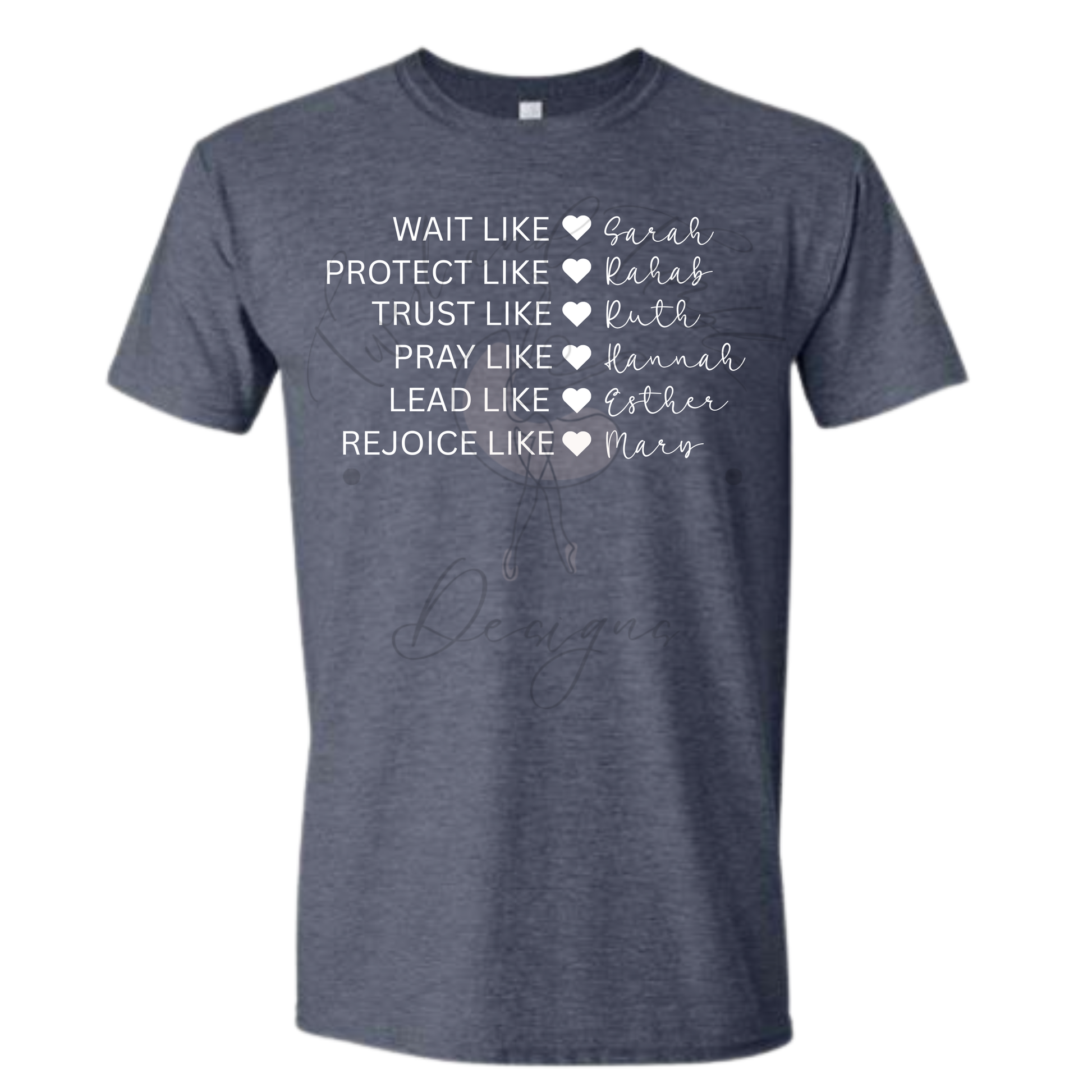 Carry timeless inspiration with you wherever you go. Our heathered navy “Faith Like Hers” T-shirt features a beautifully balanced design displaying six powerful reminders drawn from remarkable women of the Bible.